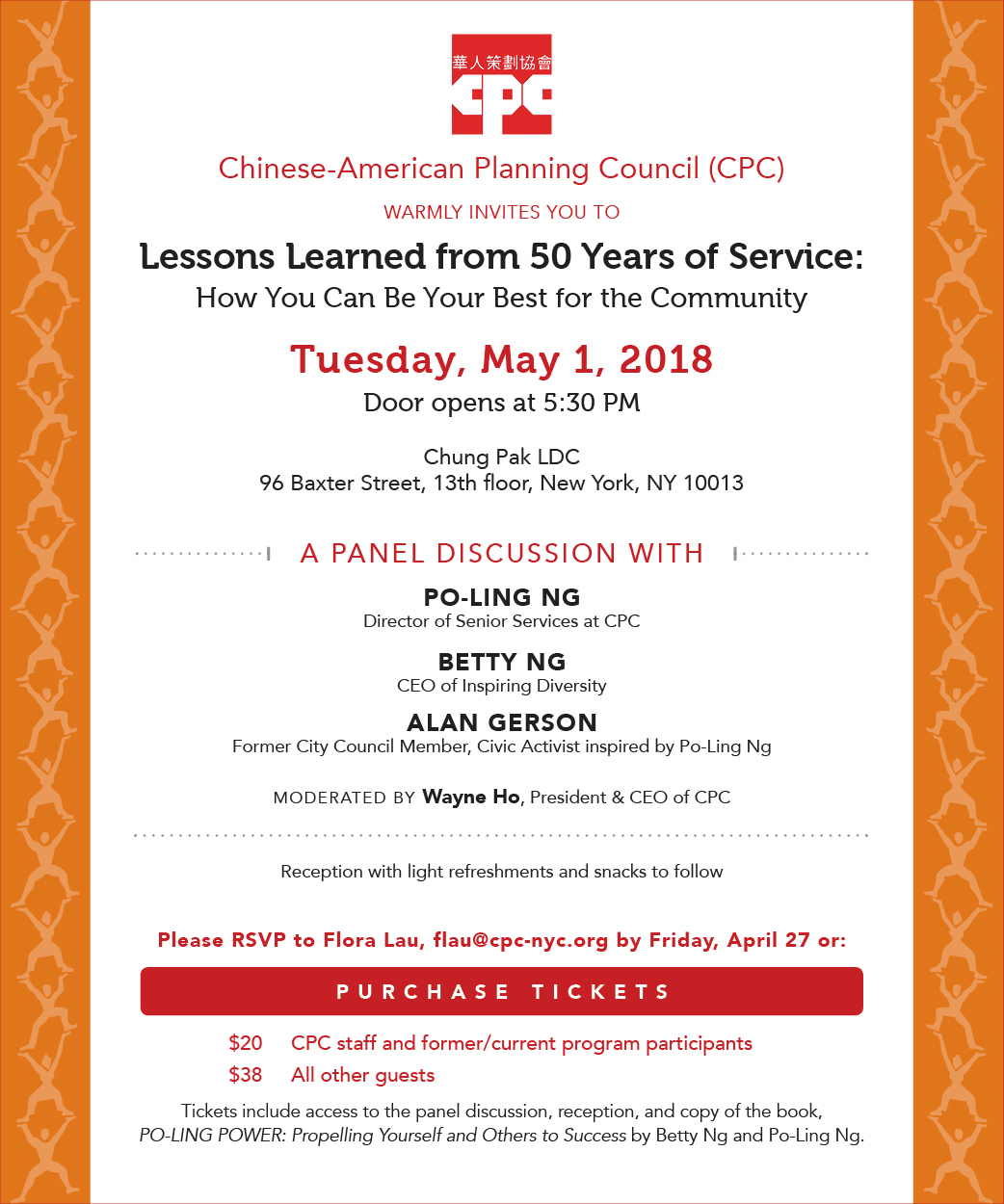 Please purchase your tickets and RSVP to Flora Lau (flau@cpc-nyc.org) by April 27, 2018.