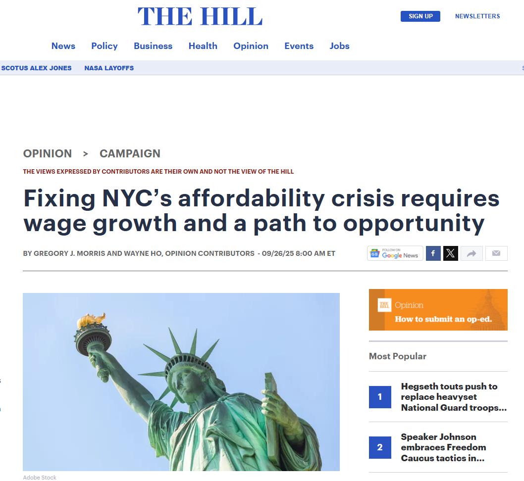 On September 26th, The Hill published a joint op-ed by CPC and the New York City Employment and Training Coalition (NYCETC) addressing the affordability crisis in New York City. The piece illustrates that resolving the crisis requires more than just housing subsidies—it also requires investment in higher wages that keep pace with the cost of living, career pathways to middle-class jobs with real mobility, and opportunities for building long-term wealth and stability.