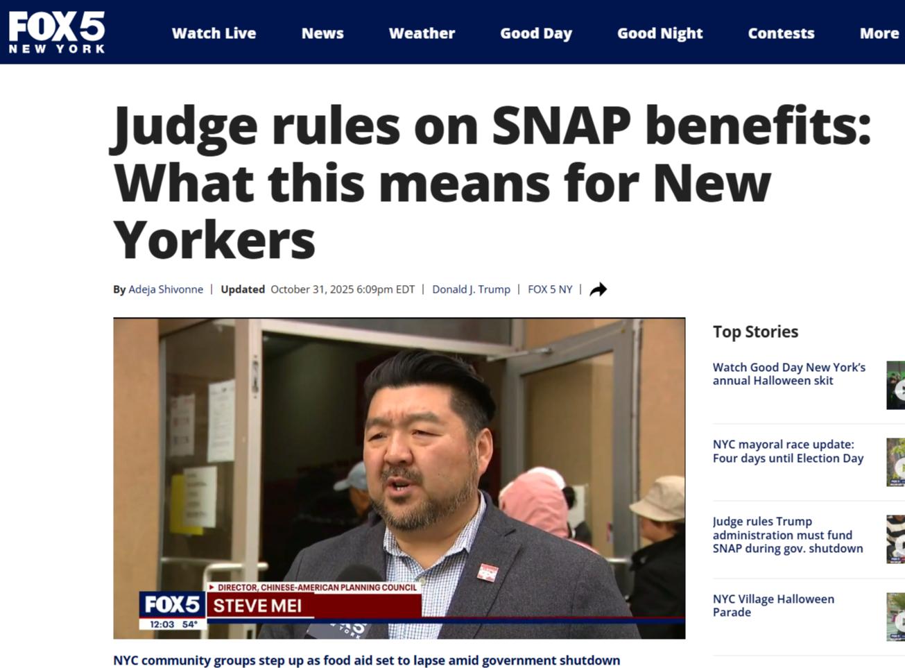 On October 31st, Steve Mei, Director of CPC Brooklyn Community Services, was interviewed by FOX 5 NY about how CPC is ramping up food distribution to serve hundreds of families. This effort comes in response to the ongoing federal government shutdown, which continues to disrupt SNAP benefits. He emphasized the severe impact on the community, where rising food costs are already stretching families to their limit, and urged those in need to seek assistance from CPC.
