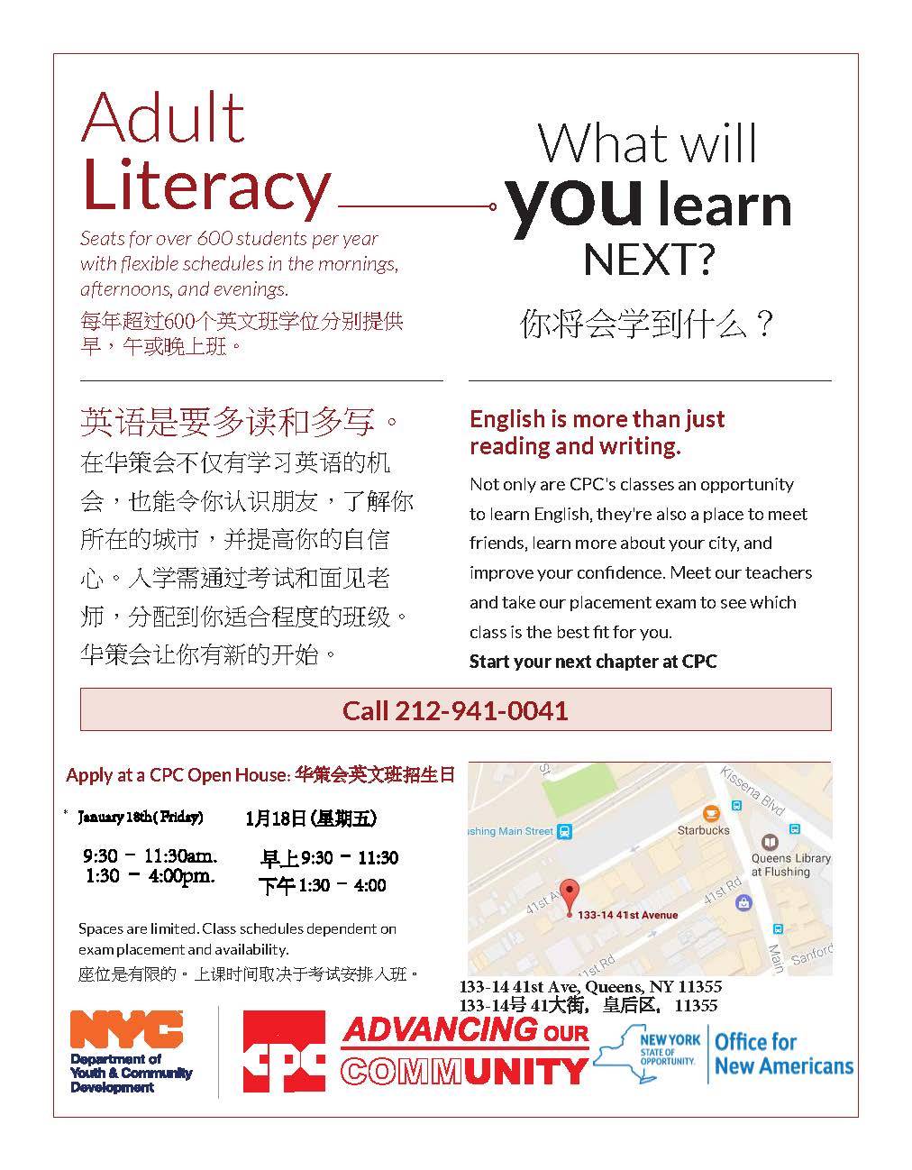 Adult Literacy Program is recruiting students at CPC Queens Community Center on Fridays 1/11 & 1/18.