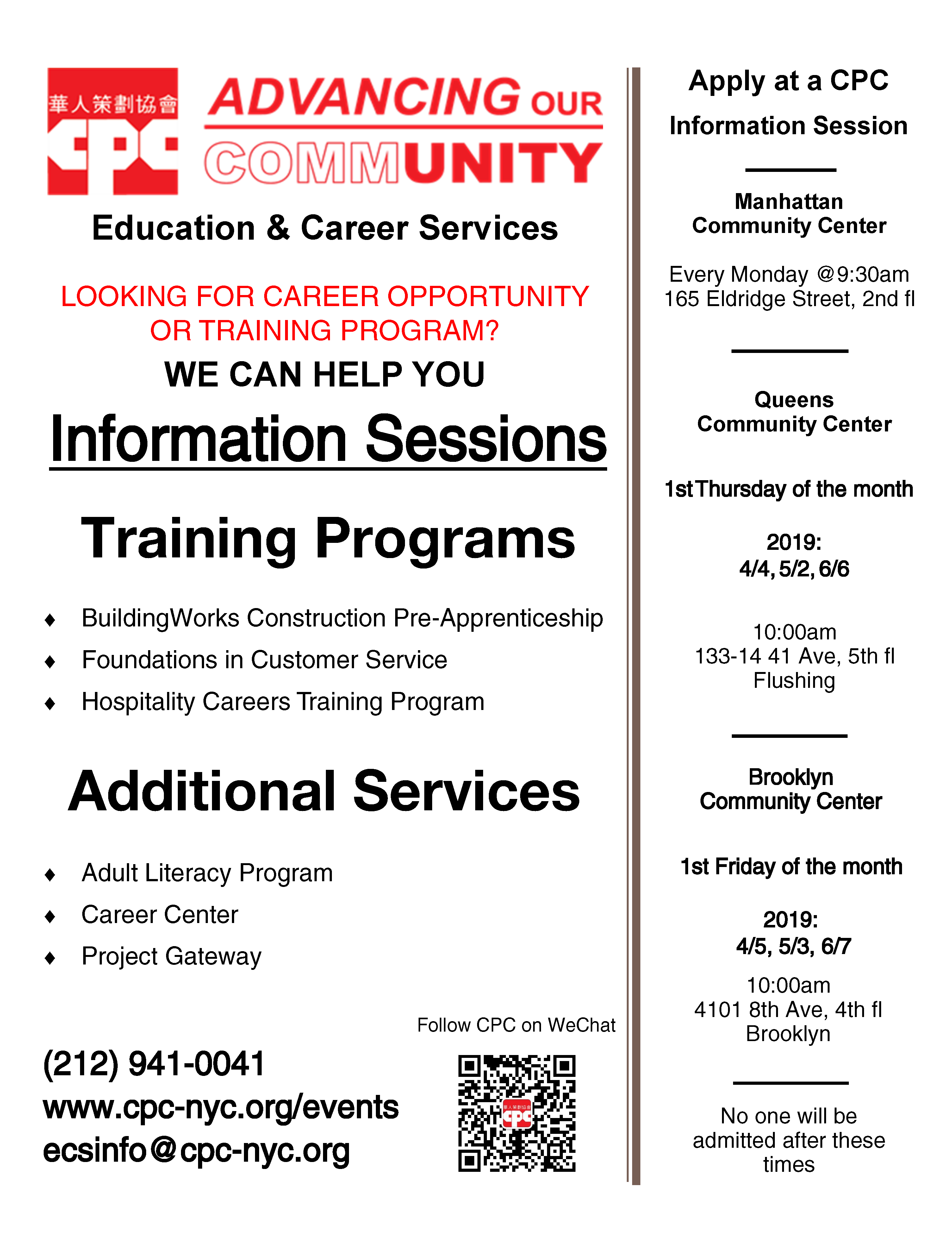 The program is FREE. Applicants for the upcoming cycle must register with CPC during an information session. The application deadline is May 10, 2019.