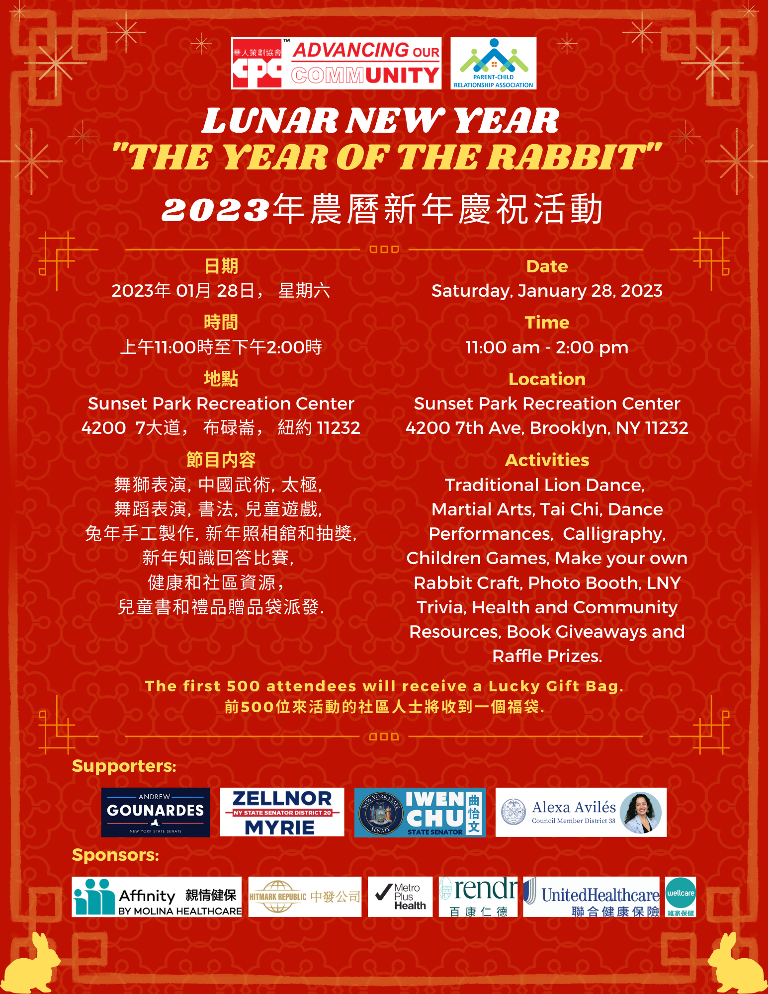 The Chinese‐American Planning Council (CPC) Brooklyn Community Services (BCS) will be holding the Lunar New Year 2023 ‐ Year of the Rabbit Celebration on Saturday, January 28th, 2023 from 11:00 AM to 2:00 PM, at the Sunset Park Recreation Center, located at 4200 7th Avenue, Brooklyn, NY 11232. Everyone is welcome to join, and we encourage friends and families of all ages to come and enjoy the festivities together.