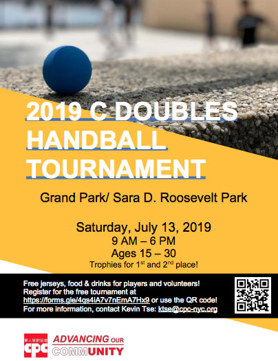 BACKGROUND: CPC's Education and Career Services is proud to announce that it will host a free C Doubles Handball Tournament on July 13th, 2019 at Grand / Sara D. Roosevelt Park in Chinatown. Nearly 90 players will be provided with refreshments during this day of friendly competition and socializing!