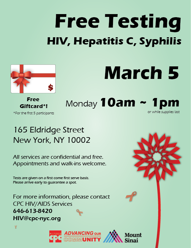 CPC HIV/AIDS Services and Mount Sinai Hospital is collaborating to provide free and confidential HIV, STD, and Hepatitis C testing.
