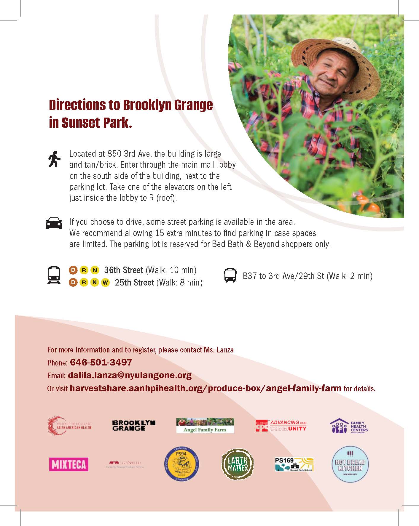 Produce are grown from Brooklyn Grange and Angels Family Farm, allowing for fresh produce to be picked up by community members on a weekly basis. Pickups are scheduled for every Tuesday.