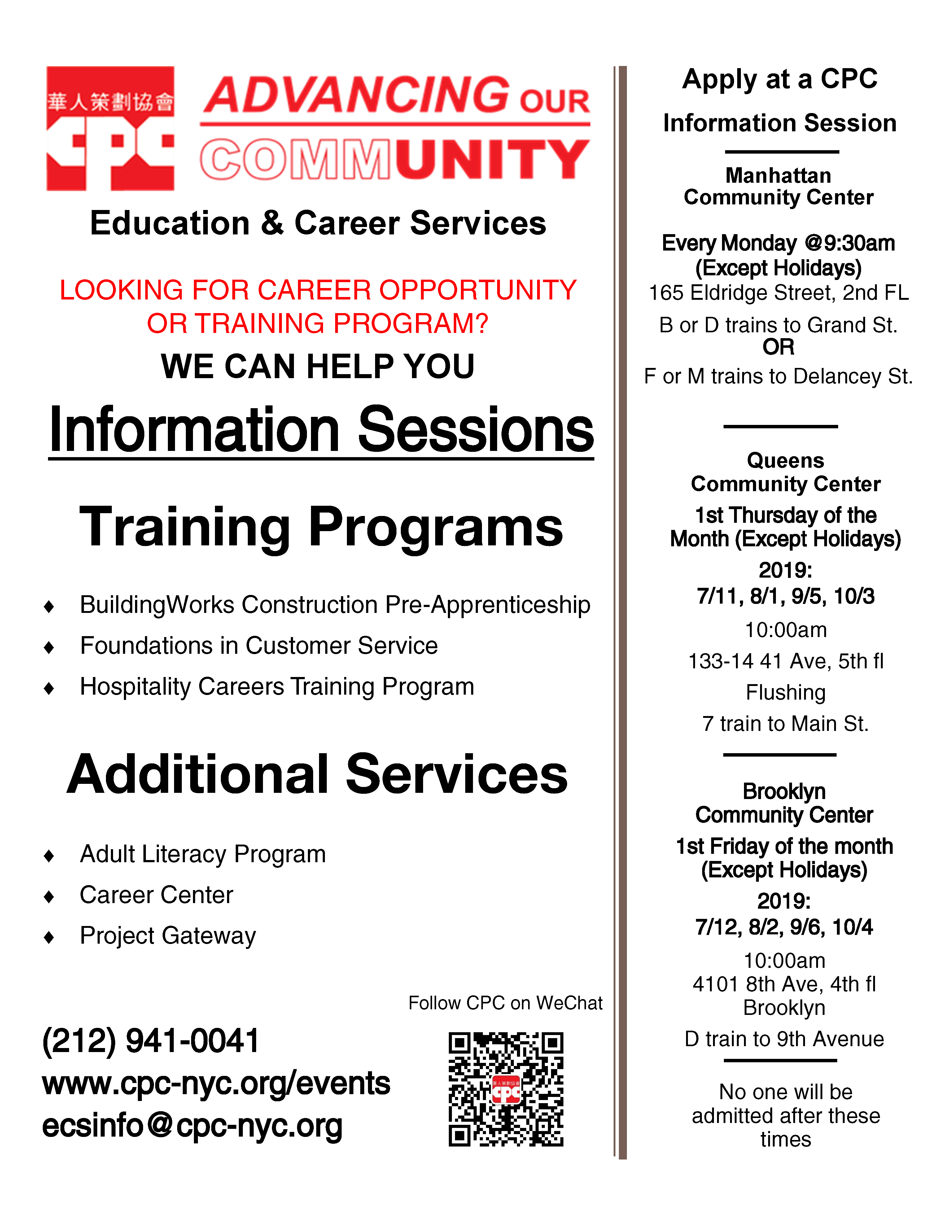 The Chinese American Planning Council is offering an intensive 8-week training program for anyone interested in working in hospitality. This is a New York State licensed training program taught by highly qualified instructors.