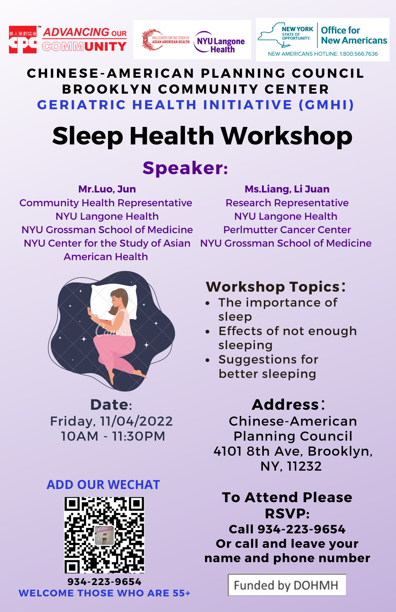 CPC Brooklyn Community Services Geriatric Mental Health Initiative (GMHI) is hosting an in-person Sleep Health Workshop on Friday, November 4, 2022. CPC has invited two speakers from NYU Langone Health, Mr. Jun Luo, Community Health Representative, and Ms. Li Juan Liang, Research Representative, to share the importance of sleep and ways to improve sleep habits.