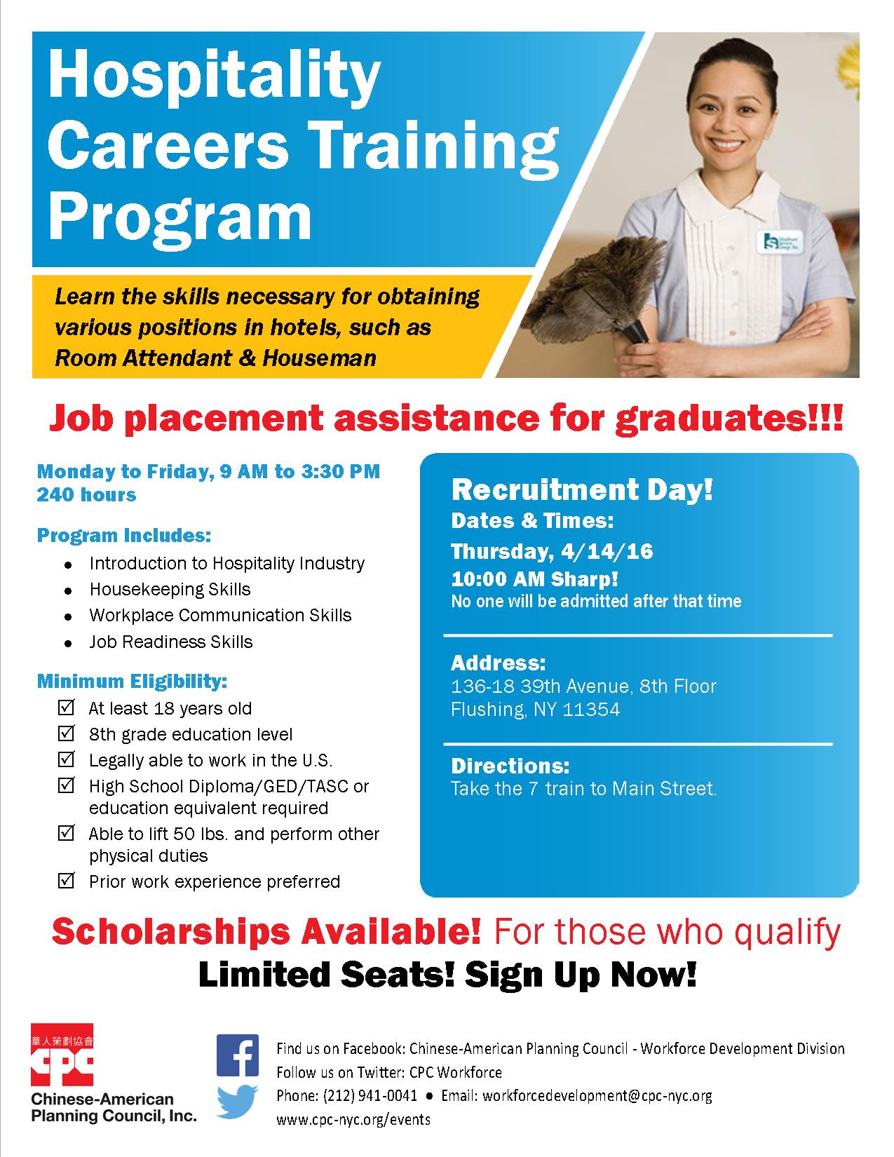 The CPC Workforce Development Division provides access to training and job opportunities to individuals eager to enter the workforce. We match your skills with the right opportunities. We are currently recruiting for Hospitality Careers Training Program.