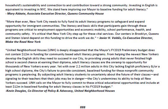 NYC Coalition for Adult Literacy Rallies for Full Funding in 2019 NYC Budget