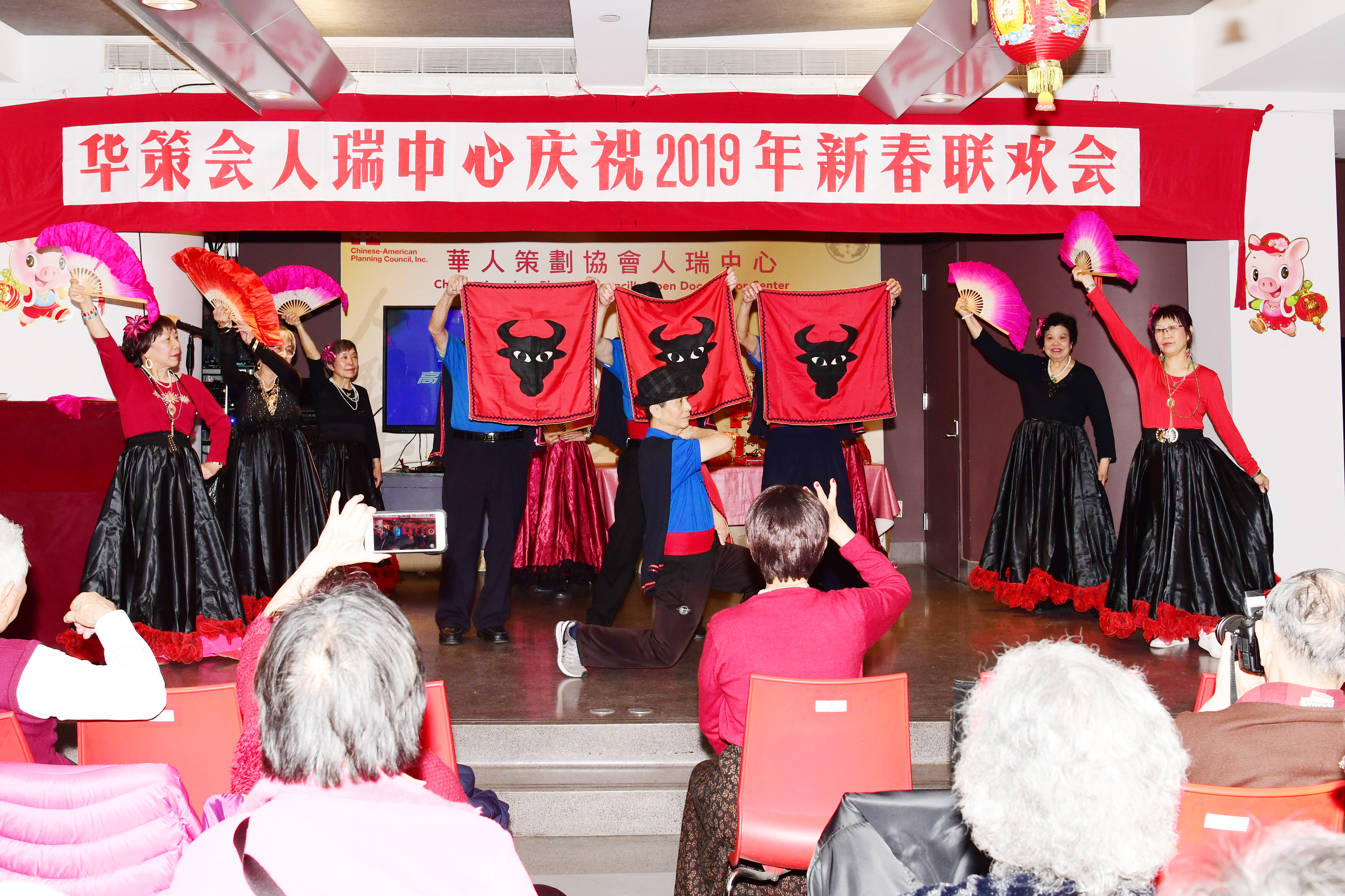 On Thursday, February 14th, CPC Open Door Senior Center celebrated the 2019 Lunar New Year and Valentine's Day with 550 of their community members. CPC Open Door's lion dance team kicked off the festivities with a performance to bring good luck and health to our members. Open Door's chorus sang, " 甜蜜蜜 ", " 恭禧發財 ", and " 一年更比一年好 ", and the dance troupe performed, " 好日子 ", and "Carmen". Besides dancing and singing, a number of community members greeted the audience with Lunar New Year greetings and blessings in their own Chinese dialects. Since it was Valentine's Day, couples were invited on stage who had been married for more than 60 years.