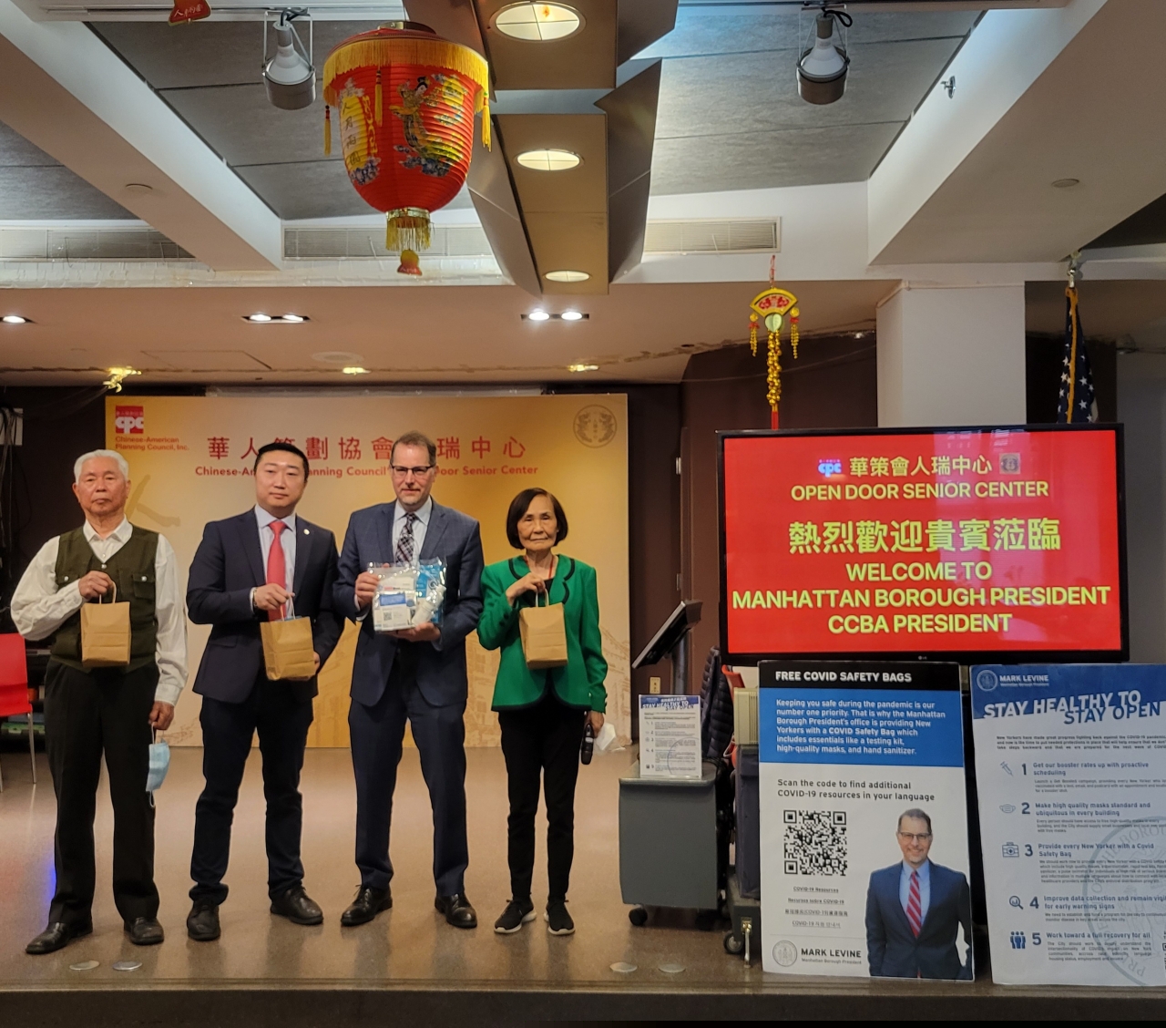 On May 4th, Open Door Senior Center welcomed both the Manhattan Borough President Mark Levine and Chinese Consolidated Benevolent Association (CCBA) President Raymond Tsang! CPC thanks them for speaking to our seniors about COVID safety and providing kits with home tests, high-quality masks, digital thermometers, and hand sanitizers. Our older adults very much appreciated having these safety tools as we continue to live with COVID and adjust to our new normal.