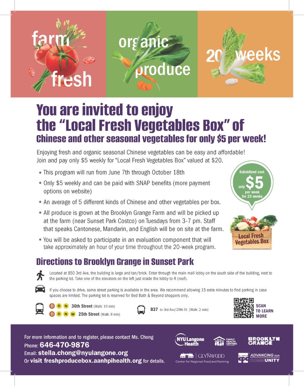 Chinese-American Planning Council is partnering up with NYU Langone, Brooklyn Grange, and Glynwood to provide community members with an opportunity to enjoy fresh and organic seasonal Chinese vegetables, grown on Brooklyn rooftops.