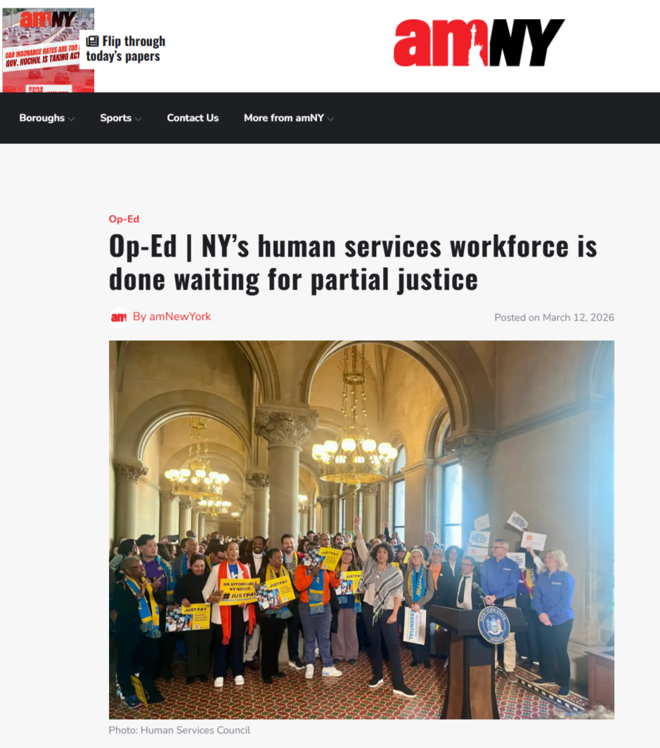 On March 12th, amNY published an op-ed co-written by CPC, NMIC, and Lutheran Social Services of New York, advocating for #JustPay for human services workers and #FairPay4HomeCare workers in New York. The article highlights that home care workers are essential to caring for our community members in need, yet they remain trapped in a wage crisis. The op-ed calls on Albany to address the urgent need to increase workers' wages to match rising costs, warning that anything less constitutes a pay cut. It also notes that recent wage gains, such as the increase for home care workers to $19.65 per hour in New York City, are undermined when the state fails to fully fund them in contracts, shifting the burden to nonprofits and causing financial strains that destabilize the very safety net New Yorkers rely on.