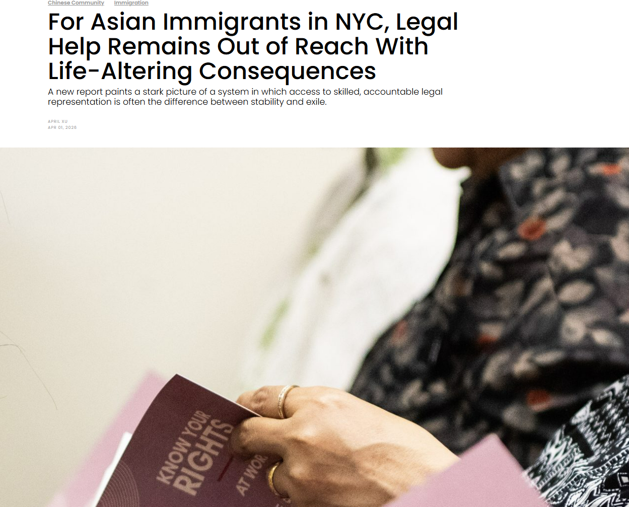 On April 1st, Documented NY highlighted a new Asian American Legal Defense and Education Fund report finding that Asian immigrants in New York City face severe barriers to immigration legal help due to language gaps, unaffordable lawyers, and other factors. Tommy Lee, Program Supervisor at CPC's ONA Opportunity Center, said the program has seen nearly double the applications in the past year. He shared the case of a CPC client detained by ICE after missing a check-in due to a car accident. The client's wife, who does not speak English, turned to CPC's afterschool program, where staff made dozens of calls to find legal help. Jack Hsia, Senior Attorney of Community Legal Services at CPC, added that free and private immigration attorneys said they were already overwhelmed with cases and did not have the capacity to take on this case, so CPC stepped in to handle it.